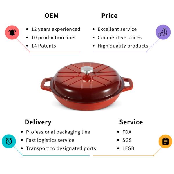 - Многофункциональный: Главная жара Retentio. Покройте эмалью Nonstick единообразие распределения Interior.Heat, хорошее влияние консервации жары. Сотейник литого железа можно использовать для того чтобы пошевелить картофель фри, braise, опаляет, глубоко жарит, печет и больше.