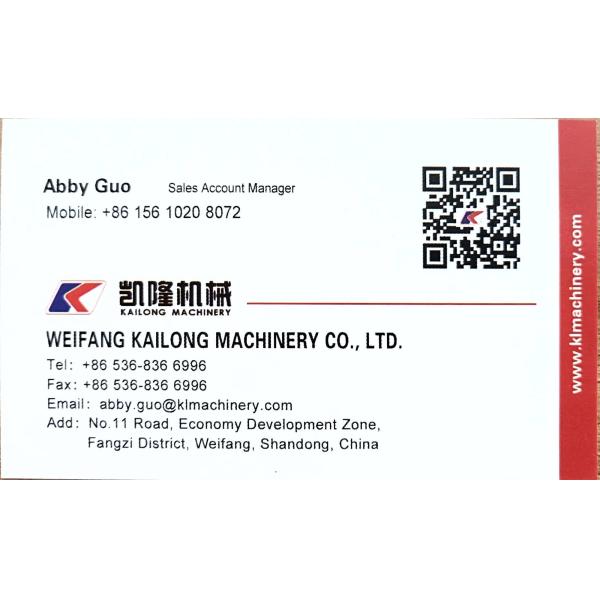 CO. машинного оборудования Weifang Kailong, Ltd высокотехнологичная компания расположенная в зоне развития экономики района zi клыка, Weifang, Китая. Компания установила в 1999, полностью больше чем 100 работников, и мы имеем 51 инженера. С самыми лучшими качественными продучтами и проектированиями, мы снабжаем подгонянные решения наши клиенты. Мы держим создать значение для наших клиентов с непрерывным нововведением, верхними качественными продучтами и самыми лучшими обслуживаниями.